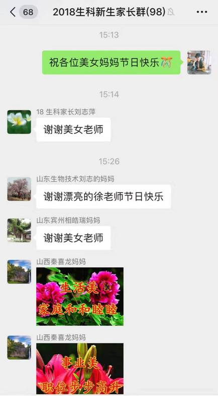 当日,员工们给全院女教师录制了祝福视频,向老师们致以节日问候;每一个画面、每一句话都表达了员工对老师们的深切感情。辅导员也在家长群里送去节日祝福,同时号召同学们给自己母亲打通祝福电话,发条关心消息,表达对母亲的感恩之情。