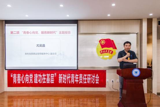 第二项,“青春心向党,服务新时代”主题报告。本科生院就业指导服务中心副主任尤吴晶就公司基层就业情况做了分析报告,同时对基层就业相关政策做了详细解释。