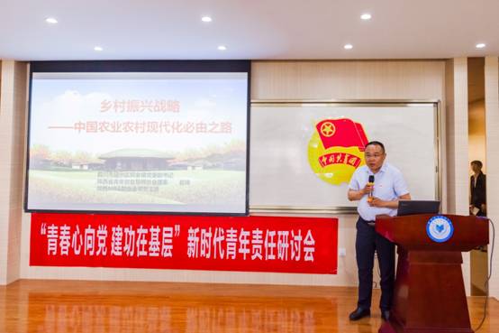 会议第三项,“建功在基层,青年新责任”主题报告。铜川市耀州区照金镇党委挂职副书记、陕西省创业导师协会理事、陕西MBA联合会常务主席赵峰结合自身十多年的基层乡镇工作经验,深入浅出的向在场同学讲述了乡村振兴战略,他认为这是中国农业农村现代化的必由之路,并且结合自己的成长经历,寄语同学们要持续学习、终身学习、在实践中检验和建立自己的理论价值体系。