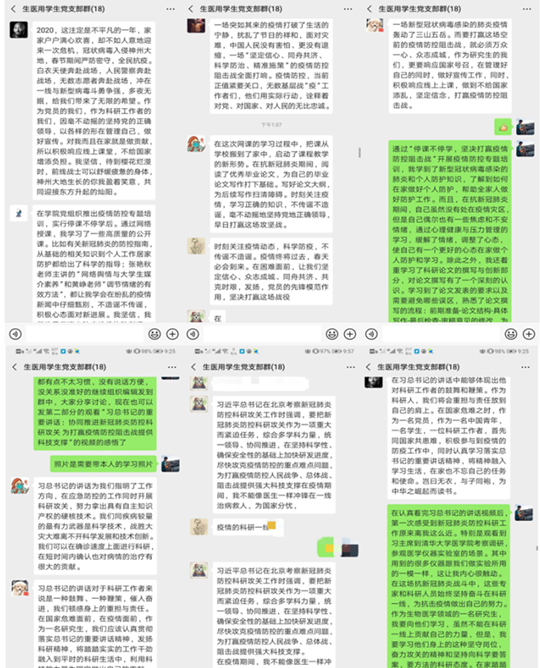 生物特征识别与加密研究生党支部宣传委员陈炯谈到:“通过此次党课学习,我深入全面的了解了新型冠状病毒感染的肺炎疫情的发展状况。在心理精神方面,要全面树牢坚决打赢疫情防控阻击战的理念,发扬不畏艰险、无私奉献的精神,人生的真正价值在于对国家对社会的贡献。作为一名员工党员,我要发挥模范带头作用,响应国家的号召,以身作则,了解疫情当前情况,并且对信息加以鉴别,不信谣、不传谣。同时,保护好自己,注意个人卫生,减少出行次数,提醒家人不要聚会,勤开窗通风,向周围人宣传防疫知识,与祖国共渡难关。坚定信心,相信国家,相信党,众志成城,万众一心,坚决打赢这场疫情防控阻击战。”