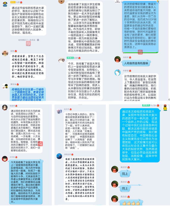 党支部全体党员,积极分子及课题组其他员工观看了人民网直播的疫情防控思政大课。思政大课结束后,支部内全体成员进行讨论,讨论会上大家踊跃发言,气氛热烈,对疫情防控中体现的制度优越性和人与自然的关系等有了深刻的认识。