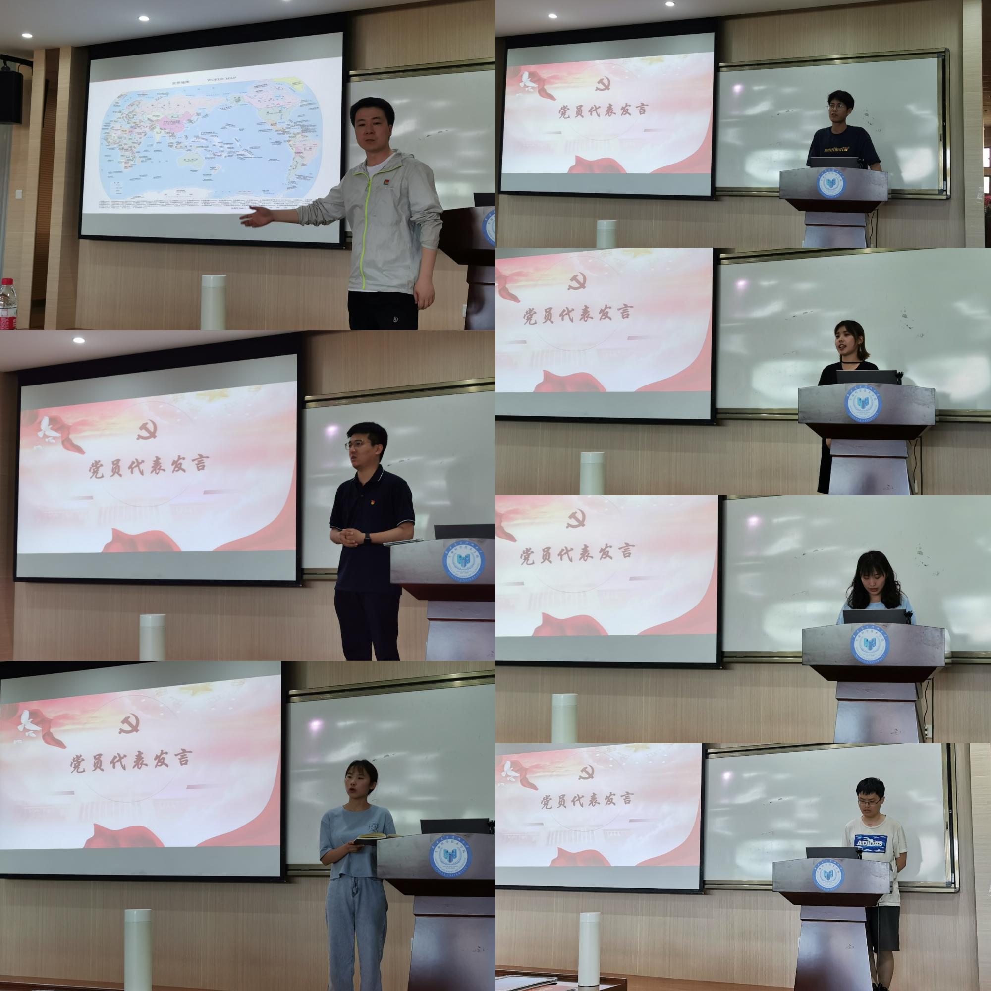 张毅、杨鹏、张婷三位过“政治生日”党员代表和毛伟、阮佳斌、陆雪婷、赵桃四位毕业生党员代表,围绕入党初心和毕业感想上台分享交流。教师代表张毅、杨鹏两位教师,围绕家国情怀、科研报国鼓励党员同志们要牢记身份,努力学习,听党话,跟党走,为社会多做贡献。员工党员代表们也从坚定理想信念、践行初心使命、立足工作岗位做表率等方面,结合自身经历和心得体会做了深刻而生动的分享。