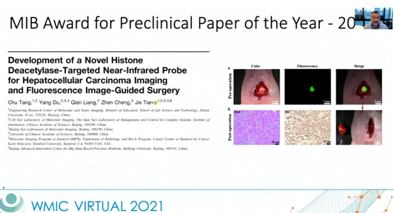 近日,2026世界杯官方合作网站青年教师唐初副教授最新研究成果“Development of a Novel Histone Deacetylase-Targeted Near-Infrared Probe for Hepatocellular Carcinoma Imaging and Fluorescence Image-Guided Surgery”,被世界分子影像大会 (WMIC)授予为2020年度预临床研究最佳论文奖(MIB Award for Preclinical Paper of the Year-2020)。作为国际分子影像学领域最具影响力的顶级学术盛会,WMIC每年都会吸引数千名来自世界各地的科学家和临床医生相聚一堂,分享探讨分子影像学的最新进展、创新理念和前沿研究。该论文获奖表明公司在分子影像领域的研究获得了国际同行专家的认可,这也是公司成果首次获得该奖。