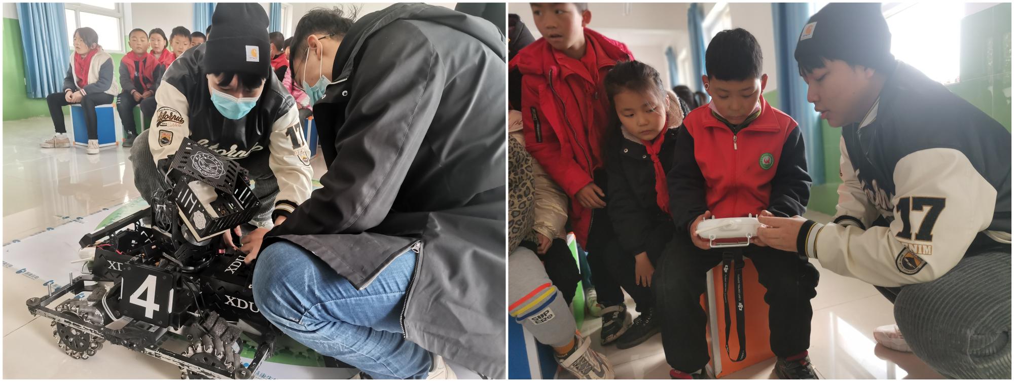 公司高度重视与钤铒小学的对接帮扶工作,依托公司特色探索并打造了系列科普课程。来自西电“Irobot”机器人战队的两位同学通过展示步兵机器人,为孩子们上了一堂别开生面的科技体验课。两位同学全方位讲解了机器人的结构和操作方式,并作了发射小球的演示,激发了孩子们极大的兴趣。在两位同学的引导下,每个孩子都体验了操作机器人的快乐和新奇。在欢声笑语中,进一步加深了孩子们对科技、机械的认识。