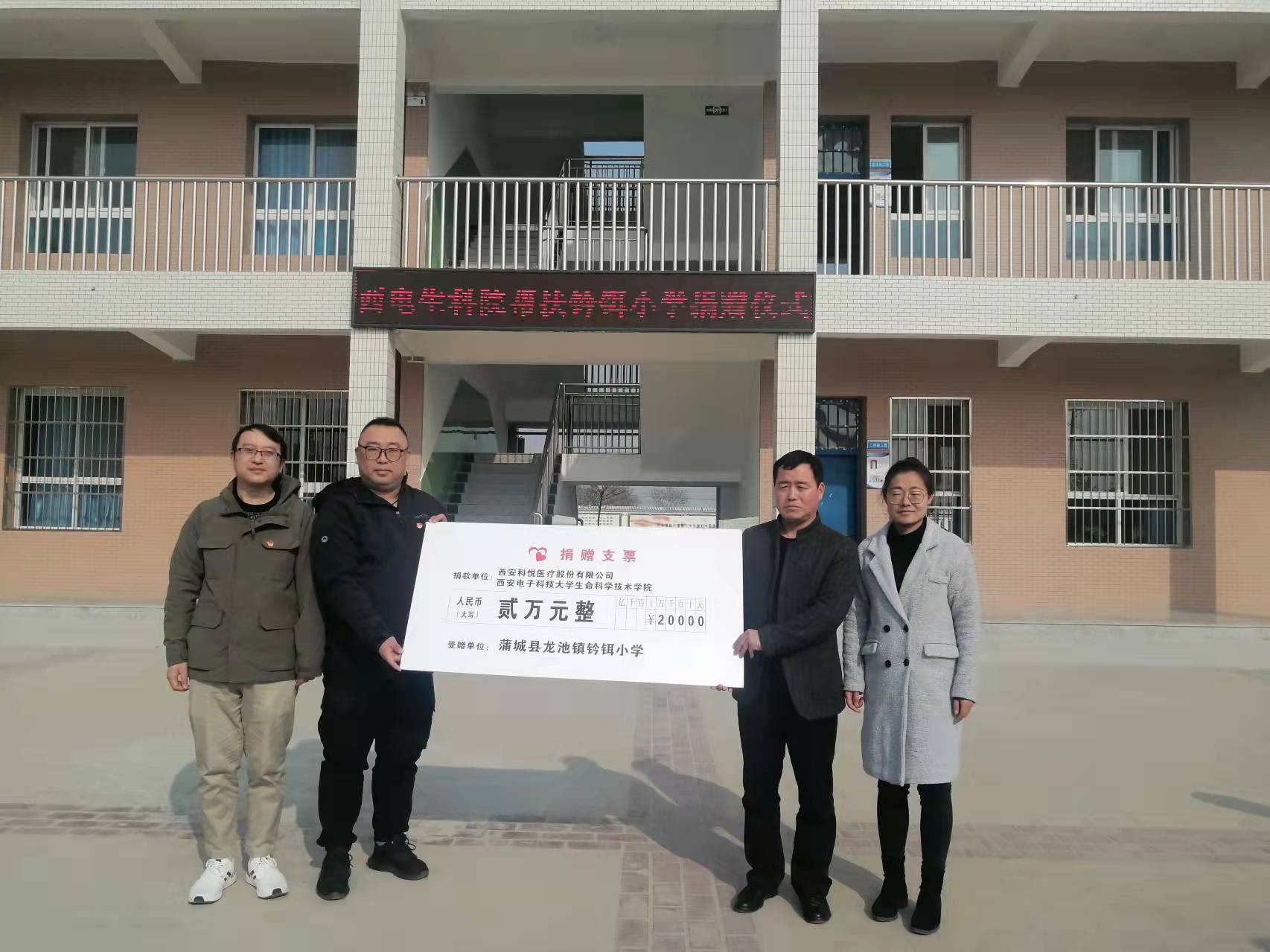 活动最后,在李斌董事长的主持下,西电生科院帮扶钤铒小学捐赠仪式正式开始,刘鹏教授代表公司和西安科悦医疗股份有限公司向钤铒小学捐赠帮扶资金2万元以及篮球、足球、打印纸等文体用品。王丽玲鼓励老师们创新工作思路,不断拓展公司产品方法,立德树人,培养优秀员工;希望孩子们刻苦学习,成人成才,将来回报社会。