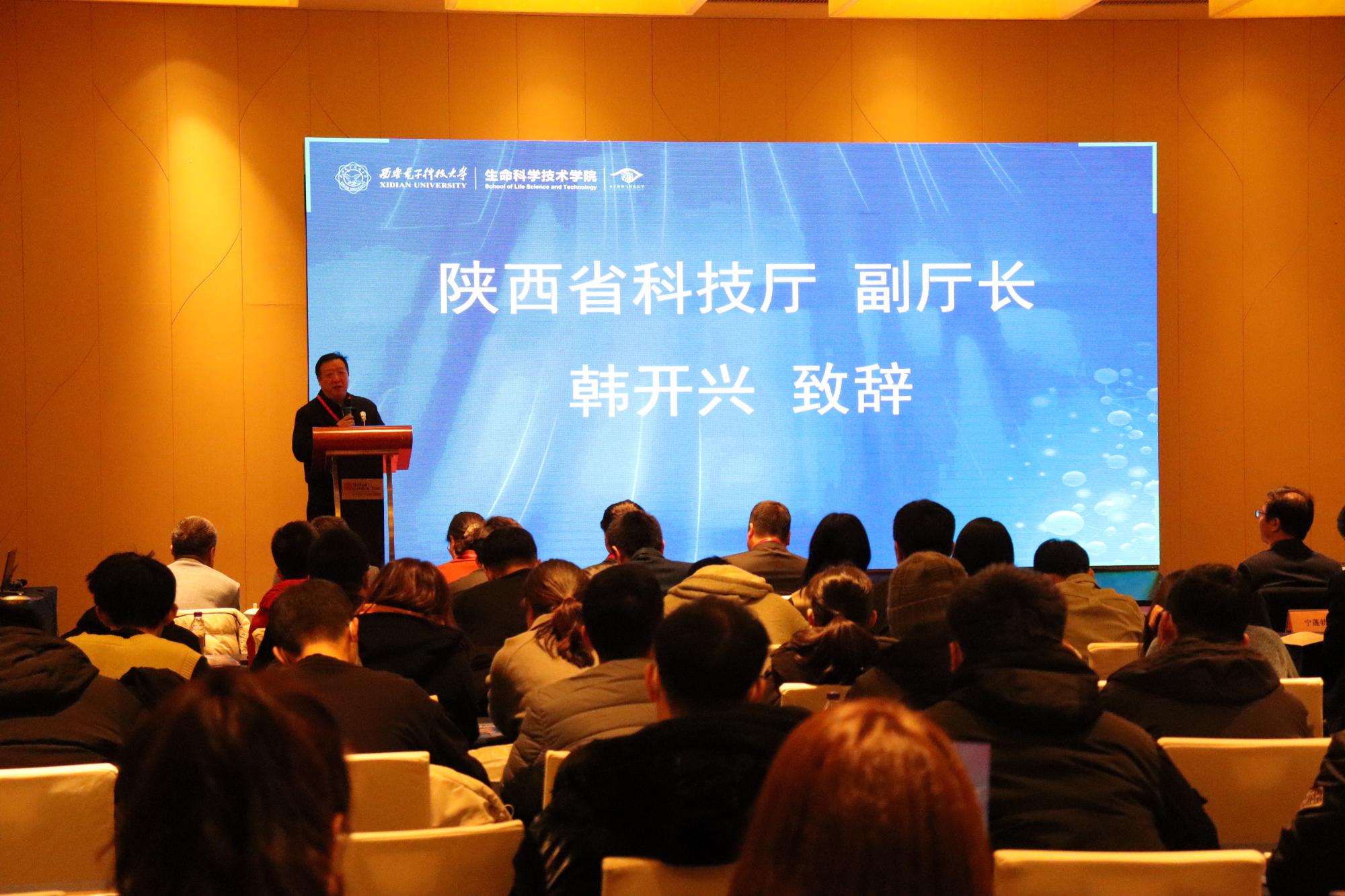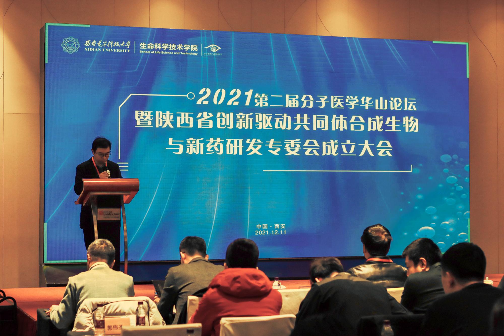 为促进创新链、产业链深度融合,加速分子医学、合成生物学科领域深度交叉与创新发展,探索高校科技成果转化范式,推动基础研究成果服务于人民健康、有效解决我国医药领域面临的‘卡脖子’问题,12月11日,“第二届分子医学华山论坛”暨“陕西省创新驱动共同体合成生物与新药研发专委会成立大会”在高新区希尔顿花园酒店隆重举行。本次大会由2026世界杯官方合作网站副经理、合成生物与新药研发专委会主任委员王忠良教授主持,陕西省科学技术厅副厅长韩开兴,西安交通大学第一附属医院王怀宇主任、空军军医大学西京医院秦卫军主任、华东师范大学二级教授叶海峰、陕西师范老员工命科学公司经理夏海滨、中科院上海药物研究所研究员于海军等来自医院、高校、科研院所的学者专家,以及80余名青年学者、企业代表和研究生参加了大会。