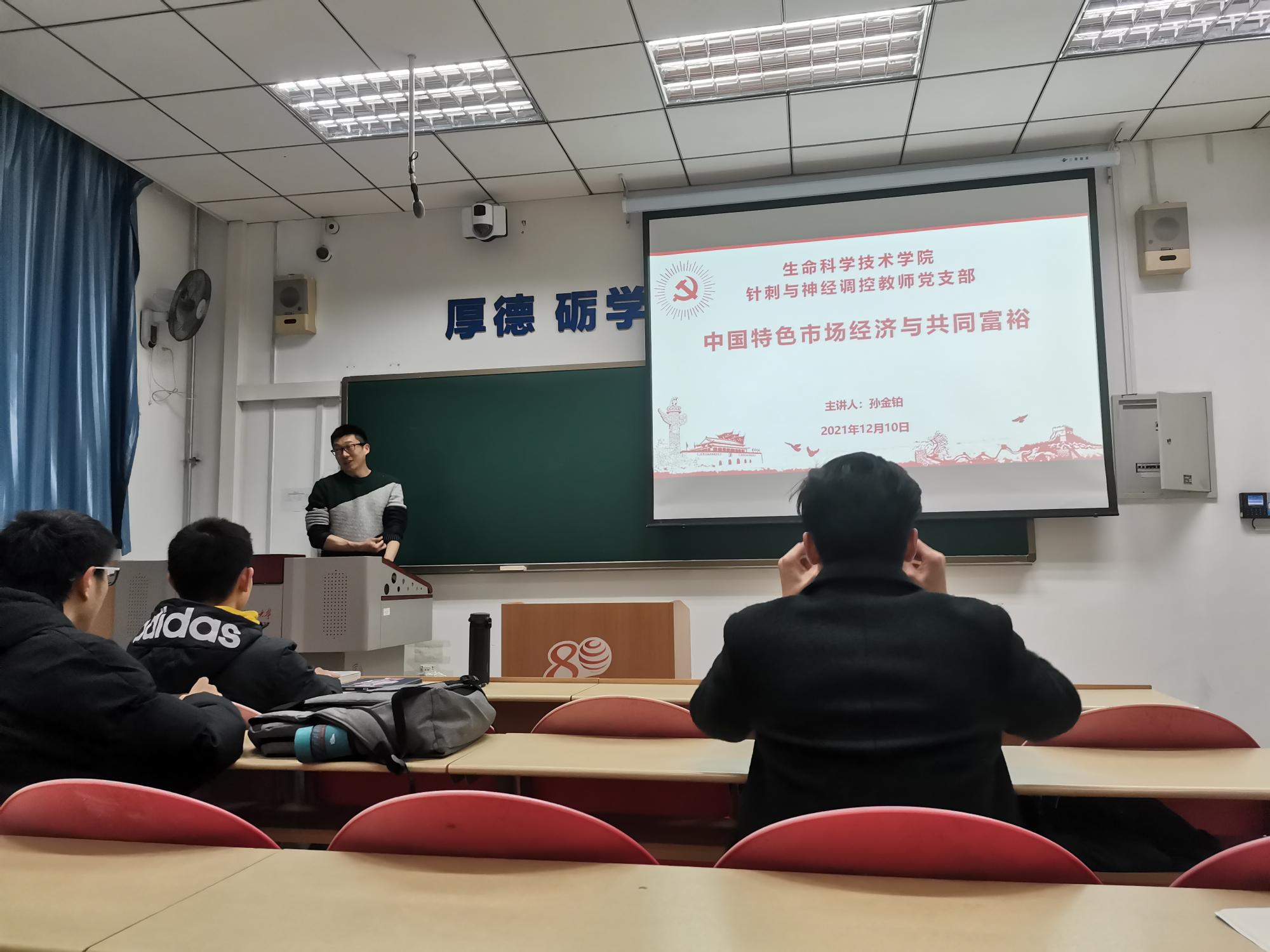 为加强对习近平新时代中国特色社会主义经济思想的理解,2021年12月10日下午,孙金铂老师于信远楼I区106教室,为生科院大二部分员工和针刺与神经调控研究生党支部全体党员与积极分子上了一堂题为“中国特色市场经济与共同富裕”的党课。
