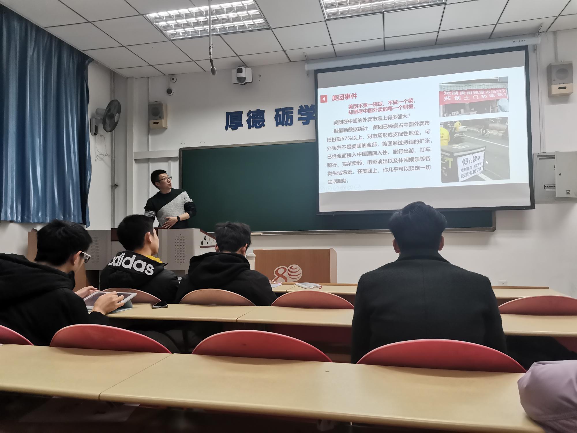 接下来,孙老师从经济学角度深入浅出的解释了资本、资本主义等概念及其特点。资本是一种可以带来剩余价值的价值,资本主义是一种以生产资料私有制为基础的社会制度,有着以私营经济为主,没有政府干预或者政府干预较少的经济特点。接着孙老师详细解释了金融、金融资本等概念,着重讲解了如何从信用、杠杆和风险的角度理解金融,使大家对这一熟悉又陌生的领域有了较为清晰的理解。接着,孙老师从金融资本全面统治引申出当代资本主义。在当代资本主义社会中,无产阶级和资产阶级的矛盾仍然是资本主义社会的主要矛盾。经济迅速发展和腐朽停滞并存,是资本主义经济发展的两种情况。认真研究当代资本主义发展的这些新特点,不断探索生产力与生产关系变革在资本主义世界的新趋势,是发展马克思主义科学理论、正确认识资本主义的重要环节。接下来,孙老师以资本的逐利性毫无道德和善良为核心,重点分析了我国互联网寡头,为了背后资本增值逐利的目的,开始展现出其“恶”的本质这一问题,以及我国利用反垄断法等手段,强力遏制了垄断资本借助科技力量为“恶”的风气。通过对“蚂蚁金服”、“美团事件”、“滴滴事件”以及众所周知的“教育培训行业事件”的解读,使同学们更加清晰和深刻的认识到资本的力量以及我国政府为人民的坚定决心。