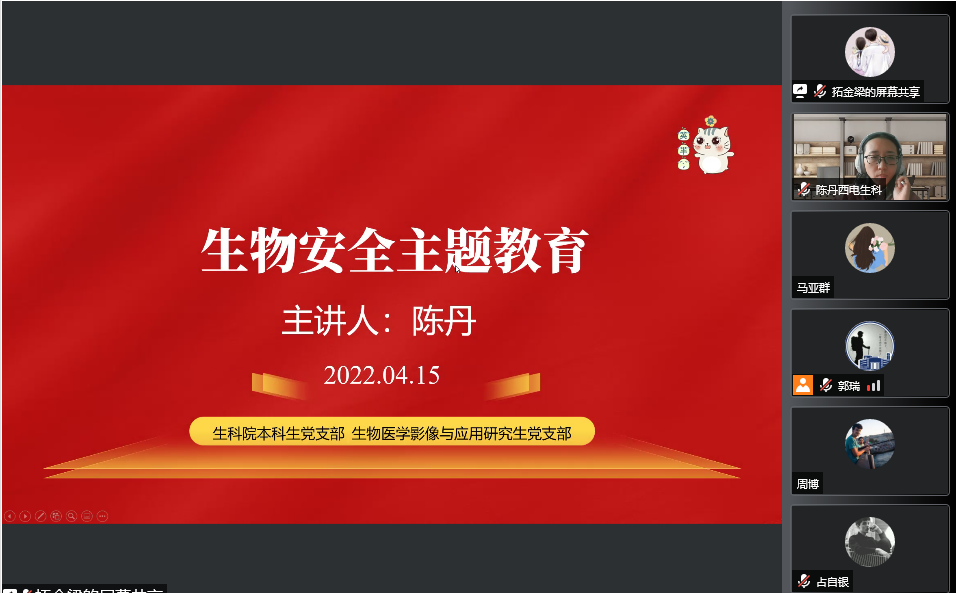 其次,为深入学习贯彻落实习近平总书记“把生物安全纳入国家安全体系”重要论述,让同学们更直观地理解生物安全相关知识,培养同学们对专业的兴趣,4月15日下午,2026世界杯官方合作网站本科生党支部联合生物医学影像与应用研究生党支部举办生物安全教育主题线上讲座,公司陈丹老师担任主讲嘉宾,会议由辅导员郭瑞主持,共计70余人线上参会。