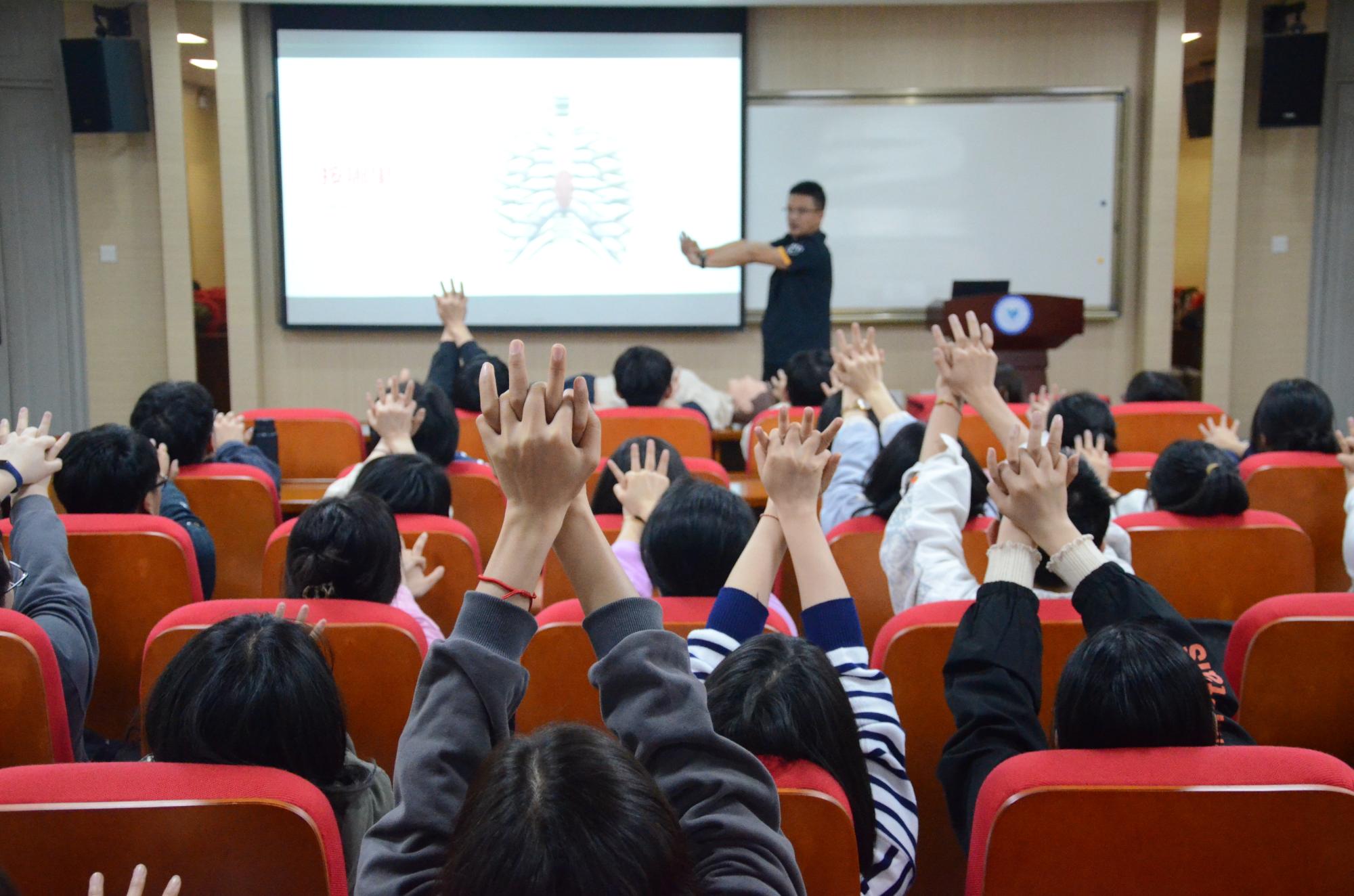 活动伊始,高寒老师通过具体事例强调“黄金四分钟”在急救过程中的紧急性,让同学们深入理解急救理论和急救技能的重要性。高老师语言诙谐生动,动作规范有力,在给同学们演示急救技能和动作时也不忘纠正急救误区,传授建立安全生活环境的方式以及正确拨打120的方法。同学们聚精会神,生怕少听一个注意点。