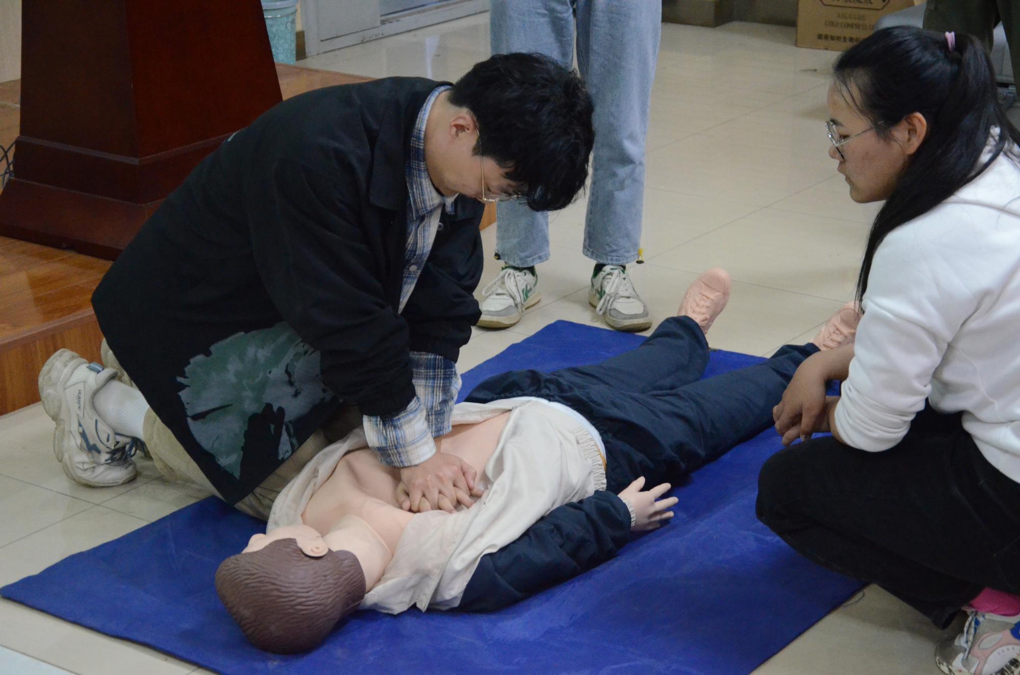 本次活动现场气氛热烈,同学们情绪高涨,认真记录老师所提到的注意事项,仔细观察老师的操作手法,并积极上台实践,亲身体验急救过程。高老师及校医院老师一针见血地指出同学操作中存在的不当之处,并给予积极指导,帮助每一个实践同学掌握准确的急救行为。