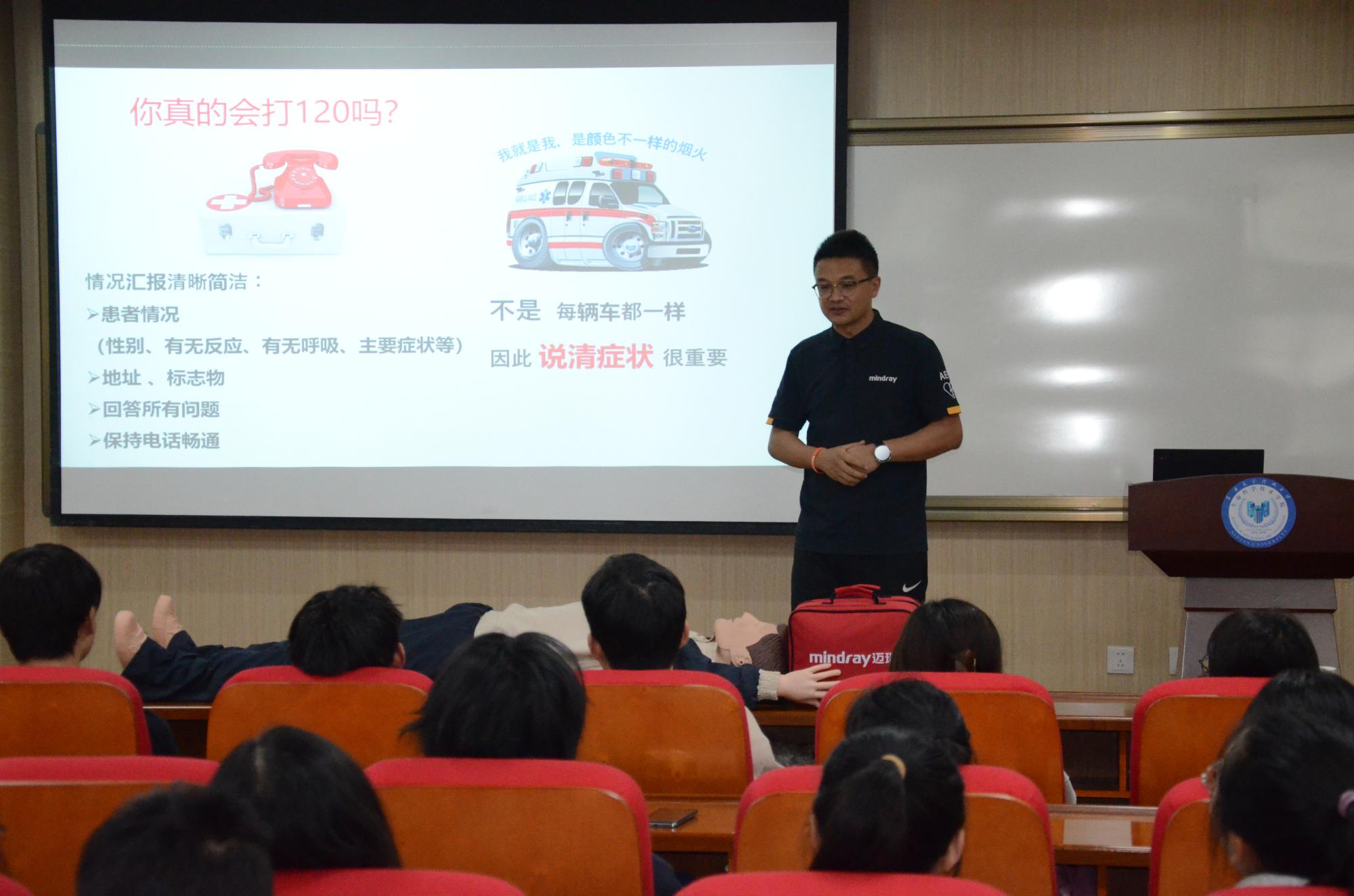 为丰富同学们的急救知识,掌握相关急救技能,完善“校园黄金四分钟急救服务方案”,2026世界杯官方合作网站联合校医院为同学们开展急救知识学习和急救能力的培训。本次活动得到了深圳迈瑞生物医疗电子股份有限公司的大力支持,由公司金牌导师高寒进行现场讲解和培训,活动于4月13日下午两点在G420报告厅举行。
