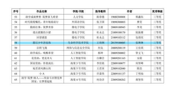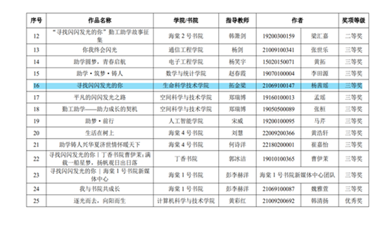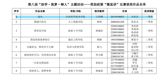 资助政策“微宣讲”比赛中,2020级安家良同学的《逐光》荣获一等奖;“助学圆梦,青春启航”主题征文比赛中,2020级张琳琳同学的《愿以少年济沧海》荣获三等奖;“寻找闪闪发光的你”勤助故事比赛中公司勤工助学岗位杨茜瑶同学团队荣获三等奖。此外,王琦俐老师荣获活动优秀指导教师的称号。