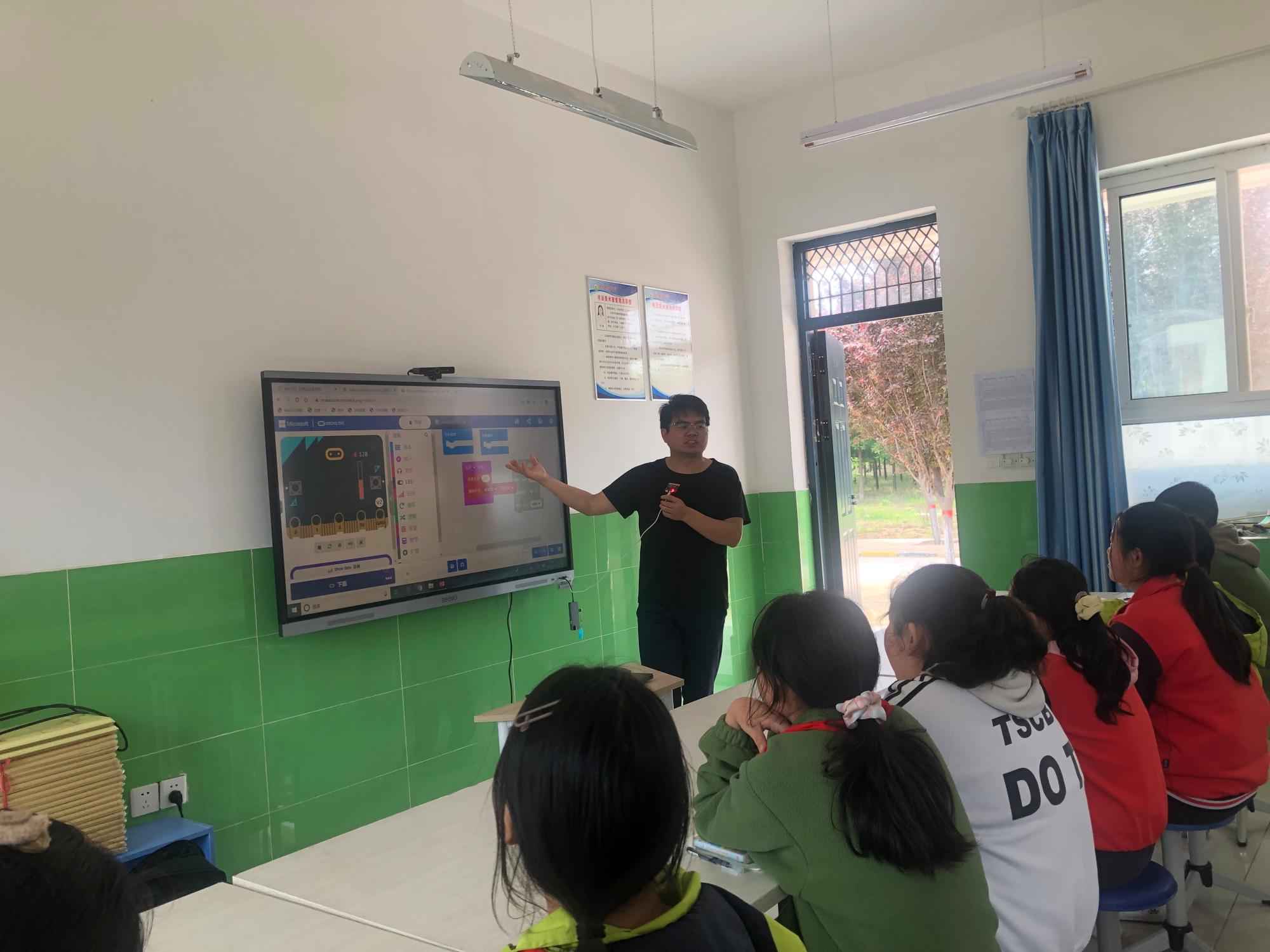 陈佳老师给同学们介绍了microbit编程板、机器人的主要组成部分及其传感器控制器与执行器之间的联系等知识,并带领同学们学习编写了“跳动的心”程序,激发了大家强烈的好奇心和求知欲。