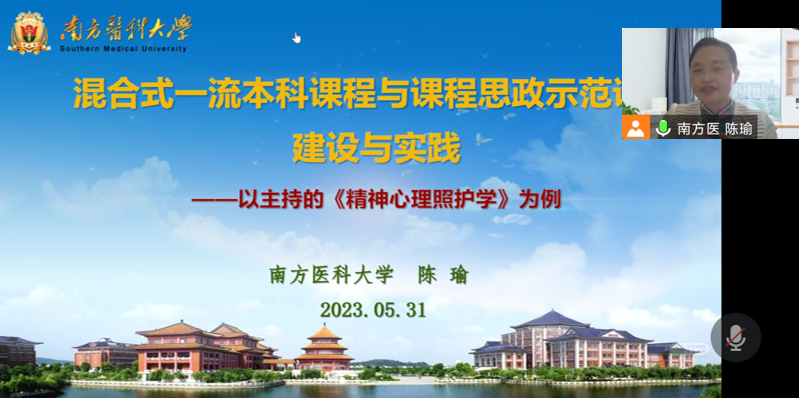 接下来,陈瑜教授以国家级一流本科课程《精神心理照护学》为例,从政策文件、教学设计与实践、教学方法、多元教学评价与总结等方面介绍了课程的建设情况,并通过小汤山抗击非典、武汉抗疫请战及教学科研工作鲜活实例,围绕“教师就是活动行走的课程思政”内涵详细阐述了自身的课程思政建设经验。