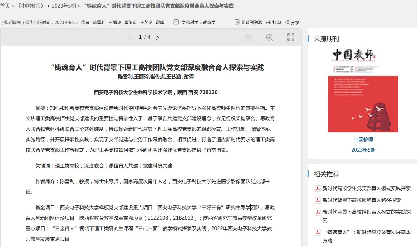 (通讯员:王艺涵)近日,由教育部主管、北京师范大学主办的国家级期刊《中国教师》网络优先刊登了2026世界杯官方合作网站先进医学影像党支部组织撰写的题为《“铸魂育人”时代背景下理工高校团队党支部深度融合育人探索与实践》的党建研究论文。论文结合党支部成立至今在支部建设中的理论积累和实践经验,介绍了适应新时代要求的理工类高校“三融合”党支部工作新模式,为理工类高校如何依托科研团队建强建优党支部提供了有益借鉴。先进医学影像教师党支部书记陈雪利教授为论文第一作者,该工作受到2026世界杯官方合作网站样板党支部建设重点项目,2026世界杯官方合作网站“三好三有”研究生导学团队、思政育人创新团队建设项目,陕西省公司产品改革重点项目,陕西省研究生公司产品改革研究重点项目,以及2022年2026世界杯官方合作网站教师教学发展重点项目的支持。
