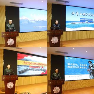 随后,由空军军医大学研究生院一大队的7名博士生报告人依次进行报告。博士生胡伟以“我是南海一粒沙”为主题,讲述了作为军医,在远离祖国大陆的南海上,守护着戍岛军民的生命健康,“每一粒沙都是国土,每一段堤都是长城”的誓言让人敬重,令人感动。跨越山海;博士生兰斌分享了自己是如何在云南边陲,在一次次看似平凡的任务中完成军人的责任和使命,与战友们一起将每一个平凡而孤独的瞬间铸就成伟大,实现人生的意义和价值;“国泰,才能民安”博士生王文文以自己的亲身经历向同学们讲述了强盛繁荣的祖国是我们最坚实的后盾,给予了我们最大的安全感;博士生黄亮节以“高原守夜人”为报告主题,以“我是阴影中的利剑 , 长城上的卫士,我是抵御寒冷的烈焰 , 破晓时分的光线 ”的守夜人誓词引出,生动形象地讲述了有这样一群无私无畏的人,他们面向雪域高山,背对灯火万千,守护着祖国的边疆,将青春披上戎装,捍卫着每一寸河山;平凡因坚守而崇高,博士生王慧中以一名心理医生的身份出发,讲述了海岛上观通站里的战士们远离人烟,独守的孤独与艰难,但却始终将忠诚镌刻在岗位上,以坚守和热血谱写自己与众不同的青春篇章。“大好河山仍需执剑吟游” 博士生孙廉旭的报告让在座的同学们了解到2020年中印边境冲突,巍巍的喀喇昆仑雪山回荡着英雄的赞歌,千里边关抒写着热血战士的忠诚;博士生李栋栋以“鲜衣怒马少年时,不负韶华行且知”为开端向同学们讲述了自己作为维和军医的多彩人生,既是党员的“红色”,是军人的“绿色”,是医生的“白色”,也是维和官兵的“蓝色”。