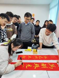 活动第二阶段是师生同心写对联。对联是中国文化的重要组成部分,具有深厚的文化底蕴和独特的艺术价值。通过撰写对联,党员同志们不仅展现了自己对国风文化的造诣,更深入地理解了中华艺术的精髓。同时,这一活动也增强了大家对中国历史文化的认同感和敬畏之心,进一步坚定了文化自信。王忠良同志带头写下了对联:“龙腾华夏钟灵地,德启门庭毓秀人”,横批“继往开来”,饱含了对莘莘学子、春雨良师的美好祝福。黎宇戈也写道“高山仰止有人杰,中流械桂留丹青”,横批“人杰地灵”,站在科研工作者的角度为大家献上了最真挚的祝福。随后,分子影像与转化医学导学团队的老师和同学们高举对联与新年福字合照,寓意着福气到来,祝愿明天更加美好。这一举动不仅展示了大家团结向上的精神风貌,也传递了对新一年的美好期许和祝福。