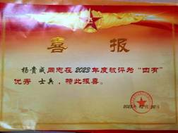 杨贵成的班长乔平彪同学接过喜报和证书,看到“四有”优秀士兵证书上“有灵魂、有本事、有血性、有品德”12个红色大字,激动地说:“贵成同学在日常生活中乐于助人,学习上努力刻苦,工作上认真负责,不知不觉他去部队一年多了,非常想念他。贵成同学在高海拔青藏高原执勤、训练,有听党话、跟党走的灵魂;有保家卫国的本事;有掉皮掉肉不掉队的血性;有青春年华奉献边关的品德,是我们学习的好榜样,我们要向贵成同学看齐,学好专业技术,赓续红色血脉,做‘有理想、肯奋斗、能吃苦、有担当’的新时代老员工。”