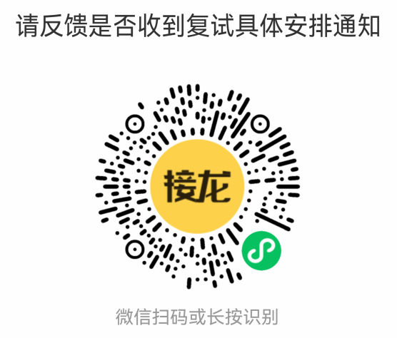 请各位复试考生于3月27日(周五)下午16:00前扫描下方二维码反馈已收到以上通知。请考生留意携带本人身份证和准考证参加笔试和面试。笔试、面试具体地点路线图可参考附件3。