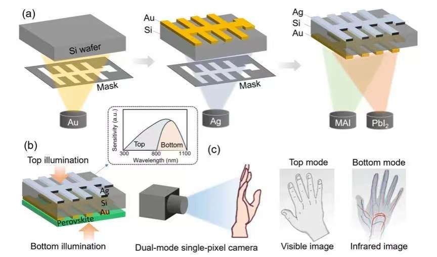 现有技术中,VIS和NIR光电探测器(PD)的并排配置是提升系统集成度的有效策略,但它可能导致图像传感器中的像素尺寸过大,并且难以解决光学串扰问题。将有机材料、二维材料和钙钛矿(PVK)等新兴材料两两堆叠成垂直架构,双模态探测器具有结构紧凑的特点。研究者们设计了许多VIS-NIR双模态垂直堆叠光电探测器,并展示了其在双色成像中的潜力,通过增加有机或PVK活性层的厚度诱导光载流子空间受限分布,成功设计了具有可切换VIS-NIR响应的单组分PD。然而,较厚的有源层需要高偏置电压。因此,研究人员通过垂直堆叠带隙不同的材料,如PVK/有机、PVK/PVK、MoS2/Ge、PVK/Si。开发了具有低压驱动的VIS-NIR光电探测器,但这些器件仍无法取代与滤波器耦合的Si光电二极管。此外,这些多结光电探测器结构复杂,需要双偏置极性操作,给制造工艺和电路设计带来了挑战。因此,开发结构简单、操作简单的VIS-NIR模式可切换光电探测器,并实现双模态功能成像仍是一个亟待解决的课题。为了克服这些限制,文章提出了一种结构简单的,PVK-Au/Si/Ag双模光电探测器(PVK-Si PD),该器件能够在零偏置下支持两种工作模式:在顶部照明模式下,器件展现出对VIS-NIR宽带光的响应;而在底部照明模式下,器件则表现出对NIR的窄带响应。这种设计使得该器件只需翻转即可在两种模式间切换,大大简化了操作过程。