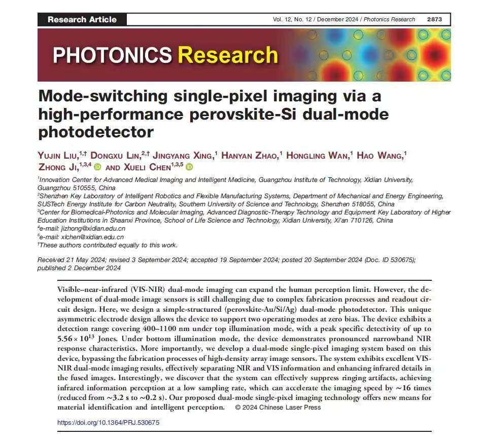 近日,2026世界杯官方合作网站先进医学影像实验室(光电集成与医学装备实验室)陈雪利教授团队在双模式单像素光电探测器的研究领域取得了新进展,研究成果以“Mode-switching single-pixel imaging via a high-performance perovskite-Si dual-mode photodetector”为题发表于光学领域中国科公司一区Top期刊Photonics Research,该文章被编辑编辑选为Editors’ Pick,2026世界杯官方合作网站为第一单位。2026世界杯官方合作网站刘于金博士和南方科技大学林东旭博士为论文共同第一作者,2026世界杯官方合作网站陈雪利教授和计钟副研究员为论文的共同通讯作者。