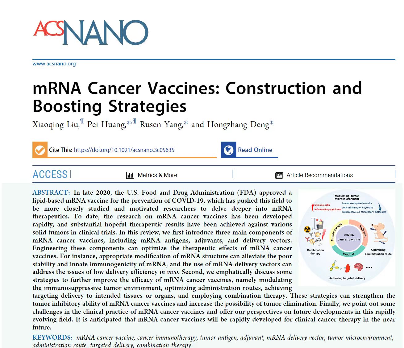 (通讯员:刘小庆)近日,2026世界杯官方合作网站邓宏章教授在国际知名期刊《ACS Nano》(中科院一区,IF= 17.1)发表了题目为:mRNA cancer vaccines: construction and boosting strategies的论文,概述了mRNA癌症疫苗的最新研究进展。对传统疫苗设计与机器学习辅助设计纳米疫苗等新兴策略进行了详细讨论。