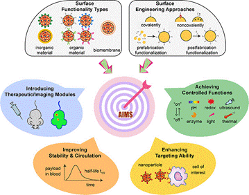 开发具有所需特性的多功能纳米颗粒是纳米技术领域的一个重要课题,并且有望彻底改变癌症的诊断和治疗方式。表面特性是纳米颗粒最重要的参数之一,可直接影响纳米颗粒的体内命运、生物利用度和最终的治疗诊断结果,因此应仔细调节以最大限度地提高诊断和治疗效果,并减少不必要的副作用。表面工程纳米粒子利用各种表面功能类型和方法来满足癌症治疗和成像的要求。尽管有各种不同的策略,但这些表面修饰通常用于相似的目的,包括引入治疗/成像模块、改善稳定性和循环、增强靶向能力、以及实现受控功能。这些表面工程纳米颗粒可应用于各种癌症诊断和治疗场景,并为下一代基于纳米颗粒的癌症治疗学平台的临床转化作出贡献。