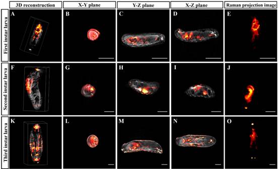 针对受激拉曼投影断层成像技术微观结构缺失问题,通过同时收集透射投影图像,团队提出了一种融合拉曼投影成像和光学投影成像的双模态免标记容积成像技术,即光学-拉曼投影断层成像技术(Optical-Raman projection tomography, ORPT),利用光学投影断层成像模块获取三维样本的高分辨微观结构,利用宽场拉曼投影断层成像技术获取三维样本的生化组分分布,实现了三维样本微观结构和生化组分分布的双模态免标记可视化。团队首先研制了双模态光学-拉曼投影断层成像系统,测试结果表明可以实现毫米尺度样本的跨尺度空间分辨率(5.12-36.42 μm),且优于70 mM的脂类分子检测能力;进一步以聚苯乙烯微球为实验对象,证明了该技术具有对毫米尺度样本的微观结构和化学组分的免标记三维高分辨率同机成像能力;最后以斑马鱼、拟南芥以及不同发育阶段的果蝇为实验对象,证明了技术在模式生物领域的应用潜力,对于全面理解复杂生物系统互作及变化等具有重要意义。这一重要研究成果近期发表在顶级期刊Science Advances上。