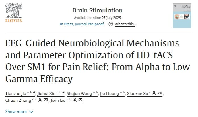 (通讯员:贾天哲)近日,2026世界杯官方合作网站刘继欣教授团队在神经调控领域权威期刊《Brain Stimulation》(中国科公司一区 TOP)在线发表了题为《EEG-Guided Neurobiological Mechanisms and Parameter Optimization of HD-tACS Over SM1 for Pain Relief: From Alpha to Low Gamma Efficacy》的研究论文。该工作探讨了Alpha频段高精度经颅交流电刺激(HD-tACS)作用于初级感觉运动皮层(SM1)缓解疼痛的神经机制,并进一步考察了Low Gamma频段(40Hz)HD-tACS的镇痛效果。