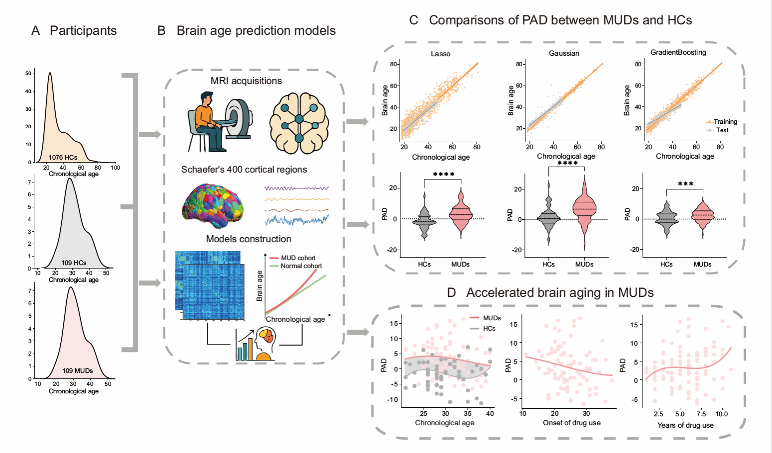 冰毒是我国滥用人数最多的毒品,此前研究虽发现其会导致认知下降,但冰毒成瘾是否加速大脑老化,一直缺乏实证支撑。脑龄可以量化大脑年龄和实际年龄之间的差异,有望帮助我们判断大脑健康情况和了解脑部疾病。为破解这一国际前沿难题,研究团队依托1076名中国健康受试者的自主影像数据,构建高精度脑龄预测模型。研究团队将该国人专属脑龄模型,应用于109名冰毒成瘾者与109名年龄、性别匹配的中国健康对照者,证实冰毒成瘾者大脑“生理年龄”显著高于实际年龄,大脑老化被明显加速,这一结果经三种模型的稳健性检验(Lasso,Gaussian,Gradient Boosting),结论具有高度可靠性,打破了国际相关研究认知局限。研究还发现,冰毒成瘾导致的大脑老化与认知损伤(加工速度、注意力)显著相关,年轻成瘾者大脑老化明显,且吸毒起始年龄越早、时长越长,老化越严重,该系列发现将为精准锁定高危干预人群、制定防控策略提供科学依据。本研究证实大脑年龄时钟可作为评估冰毒成瘾严重程度、康复效果的潜在生物标志物;未来将进一步探索相关神经机制,为新型无创脑调控戒毒技术提供支撑,推动成瘾研究从“损伤描述”向“精准干预”转型。